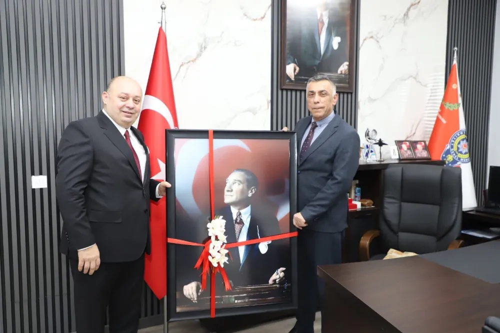 Ziyaret kapsamında Başkan Palaz, Mustafa Kemal Atatürk’ün çerçeveli portresini Kaymakam Altıntaş ve Emniyet Müdürü Zeybek’e takdim etti.