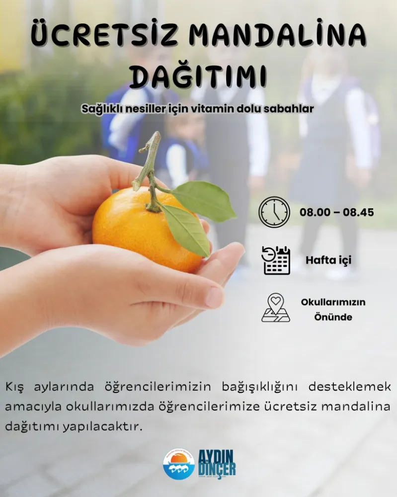 Marmara Adalar Belediyesi, kış aylarında öğrencilerin bağışıklığını desteklemek amacıyla anlamlı bir uygulamayı hayata geçiriyor. Belediye Başkanı Aydın Dinçer, okulların önünde hafta içi her sabah öğrencilere ücretsiz mandalina dağıtılacağını açıkladı.
