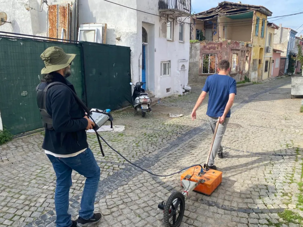 Yeraltı Radarı; elektromanyetik dalgalar aracılığıyla yer altını kazı yapmadan haritalamaya yarayan jeofizik bir yöntem olarak öne çıkıyor. Bu çalışmalarla, Ayvalık’ın kuzey-güney aksında deniz kıyısı ile 80 metre kotuna sahip tepe yamacı arasında gelişen kent planlamasının tarihsel kurgusu inceleniyor. Araştırma kapsamında, 19. yüzyılda deniz kıyısının ıslah edilerek endüstri alanları yaratıldığına dair hipotezlerin doğruluğu da sorgulanıyor.
