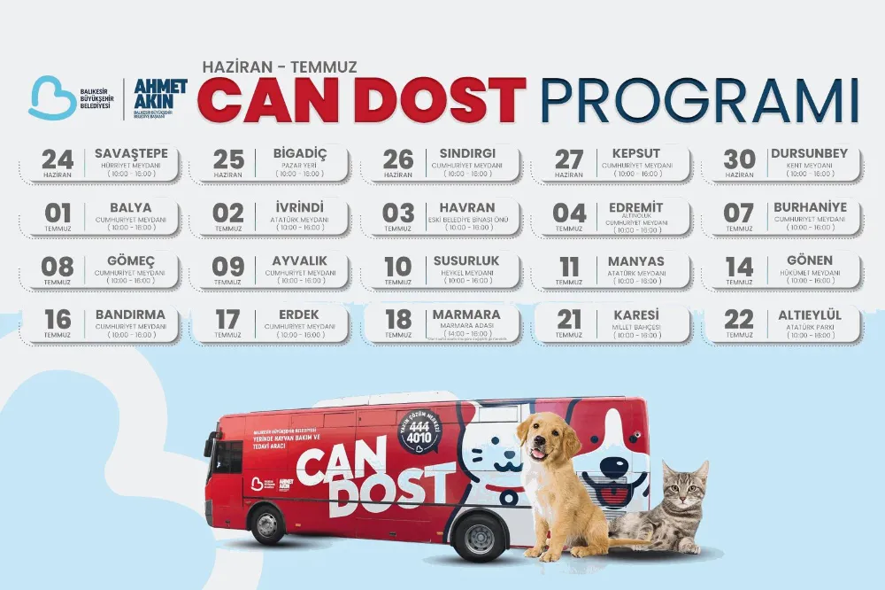 Balıkesir’de ilçe ilçe dolaşarak sokak hayvanlarına ücretsiz tedavi desteği sağlayan mobil hayvan bakım ve tedavi aracı “Can Dost” un, Haziran-Temmuz ayı takvimi belli oldu. “Can Dost”, farklı ilçelerde belirli günlerde sokak hayvanlarına kuduz aşısı ve parazit uygulaması yapmasının yanı sıra can dostlara tedavi hizmeti de veriyor.