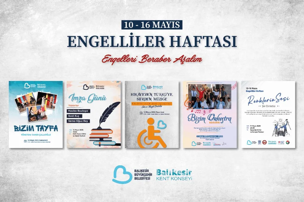 Engelsiz Şehir Balıkesir" hedefiyle toplumun her kesiminin ihtiyacına yönelik hizmet üreten Balıkesir Büyükşehir Belediye Başkanı Ahmet Akın özel gereksinimli bireylerin hayatını kolaylaştırmak için tüm imkânları seferber ediyor. Başkan Akın öncülüğünde Balıkesir Kent Konseyi Engelsiz Şehir Balıkesir Meclisi’nin de katkılarıyla 10-16 Mayıs Engelliler Haftası kapsamında düzenlenecek beş ayrı etkinlikle toplumsal farkındalığın artırılması hedefleniyor. Bu kapsamda 10-16 Mayıs tarihleri arasında gerçekleşecek olan imza gününde ünlü yazarlar Hasibe Boztepe, Suat Kuş ve Sema Oğuz Bey okurlarıyla buluşacak ardından “Bizim Tayfa" adlı tiyatro oyunu sahnelenecek. “Hikâyeden Türküye, Şiirden Müziğe" dinletisi ve sonrasında özel gereksinimli çocukların oluşturduğu “Bizim Orkestra" da Engelliler Haftası’na renk katacak. Susurluk’ta ise “Renklerin Sesi" adlı şiir dinletisi düzenlenecek.